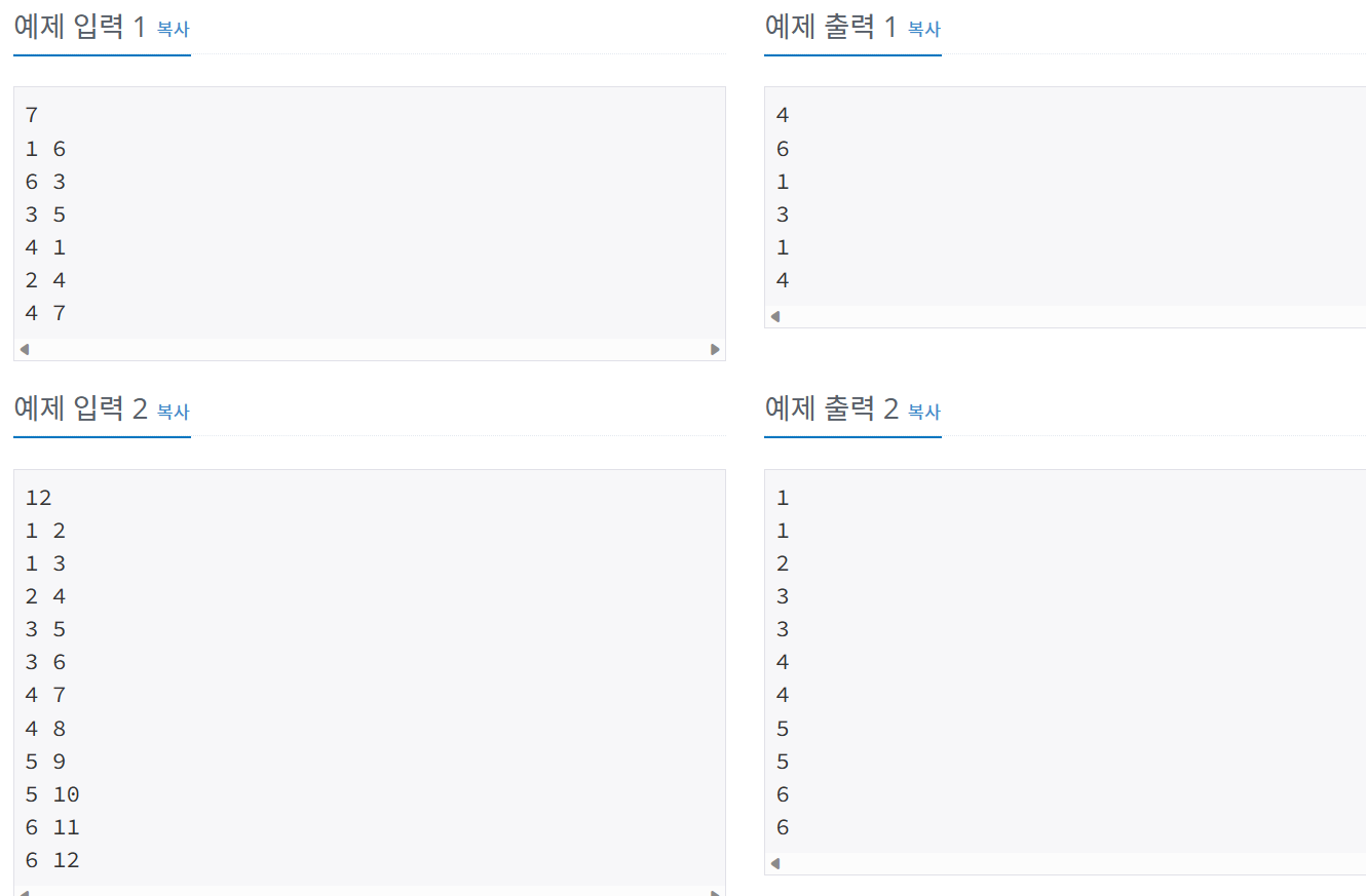 루트 없는 트리가 주어진다. 이때, 트리의 루트를 1이라고 정했을 때, 각 노드의 부모를 구하는 프로그램을 작성하시오.