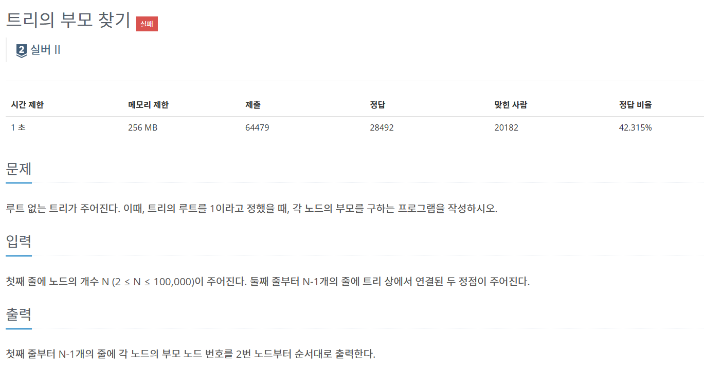 이 문제에서는 bfs나 dfs로 푸는 문제라고 한다. 왜 그런가 생각해보면 트리가 이미 있고 , 각 트리의 정점 정보가 주어졌을 때 나는 그 트리를 순차적으로 따라 내려가면서 부모노드만 기록해주면 되기 때문이다. bfs로 구현해보았다.