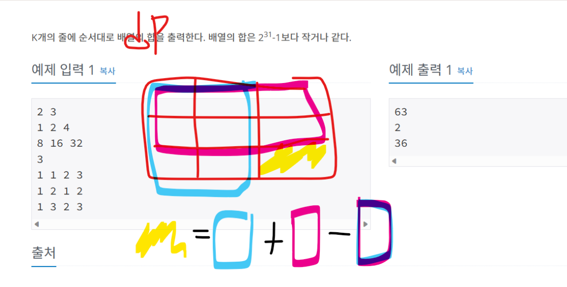 이런식으로 왼쪽으로 한 칸까지의 값 + 위 쪽으로 한 칸까지의 값 - 대각선 위쪽 까지의 값...