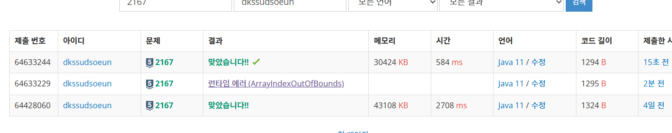 아래는 처음 for문 돌려서 푼 건데 위에 다이나믹으로 풀었을 때가 정말 시간이 빨라진 걸 볼 수 있었다 !!