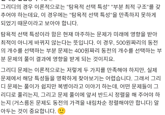 이 개념이 좀 헷갈렸는데 500 100 50 10 같은 완벽하게 그리디 적용할 수 있는 것도 내가 지금 500원을 고르냐 안 고르냐에 따라서 100원의 선택값이 달라지니까 영향을 줄거라고 생각이 든다. 근데 이 경우는 그리디 적용이 가능한 거고