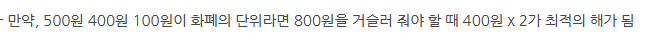 뭔가 알 것도 같다. 800원을 거슬러줘야한다고 할 때 500 * 1 , 100 * 3가 최적인데
