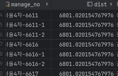db에서 x, y 값 뽑아서 거리 계산 후 저장하면 이렇게 나온다.