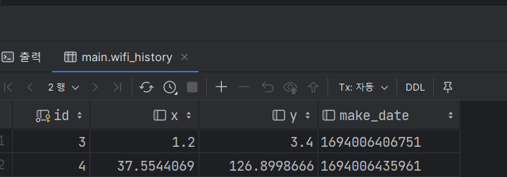 String insertsql = "insert into wifi_history (x, y,make_date)"
