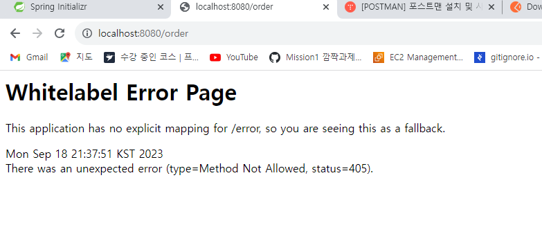 더 찾아보니까 GET 방식으로 접속을 시도했는데@PostMapping이 되어있어서 그런다고 한다.