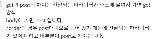 /order로 접근했을 때 param에 key와 value로 보내주는 것이 아니라 json 형태로 본문에 담아서 보내야한다.