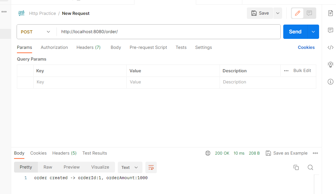 return "order created -> orderId:1, orderAmount:1000";