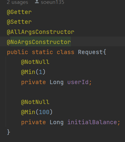 이 CreateAccount.Request 가 기본생성자가 없었다 !