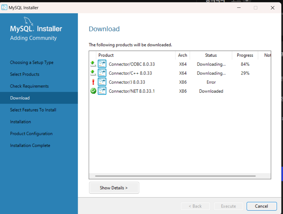 MySQL 설치 주소https://www.mysql.com/downloads/원하는 Setup Type 설정Check Requirements 단계에서 Next -> Yes 선택Installation 단계에서 설치 목록 확인 -> Execute설치 완료가 되면