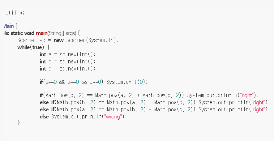 입력은 여러개의 테스트케이스로 주어지며 마지막줄에는 0 0 0이 입력된다. 각 테스트케이스는 모두 30,000보다 작은 양의 정수로 주어지며, 각 입력은 변의 길이를 의미한다.