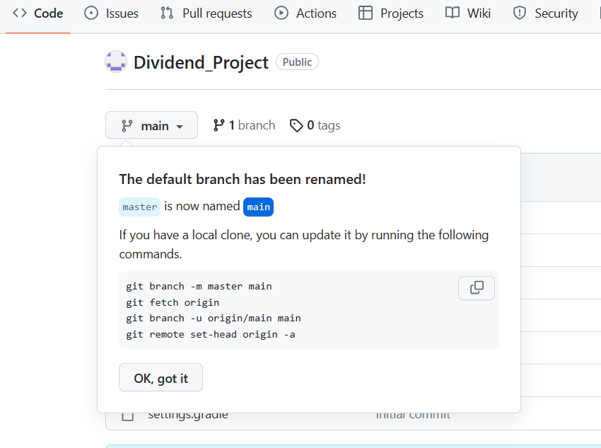 인텔리제이 프로젝트에서 연결된 리포지토리의 default 브랜치의 이름을 main으로 바꿨다.