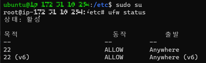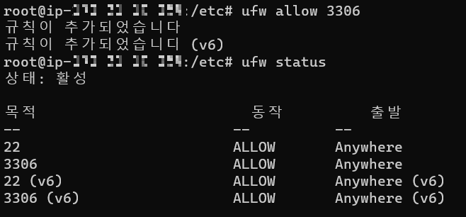 2. ufw status는 방화벽 상태 확인3. ufw allow 3306으로 방화벽 추가