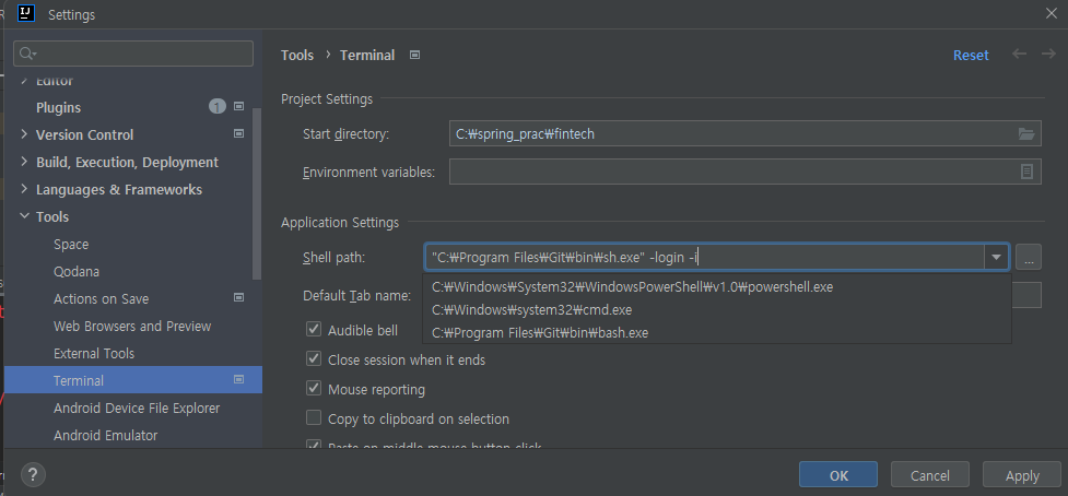 인텔리제이의 기본 터미널을 git bash로 변경해줌.