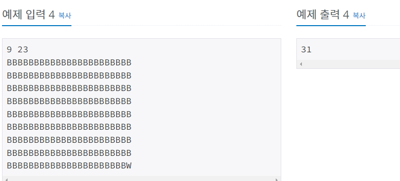 첫째 줄에 N과 M이 주어진다. N과 M은 8보다 크거나 같고, 50보다 작거나 같은 자연수이다. 둘째 줄부터 N개의 줄에는 보드의 각 행의 상태가 주어진다. B는 검은색이며, W는 흰색이다.
