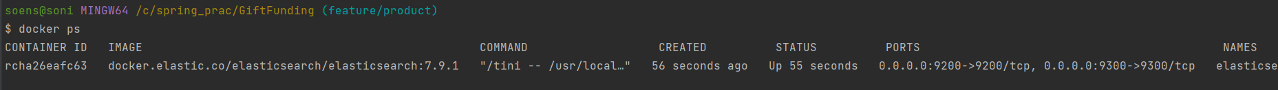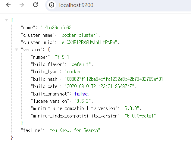 $ docker run -d -p 9200:9200 -p 9300:9300 -e "discovery.type=single-node" --name elasticsearch docker.elastic.co/elasticsearch/elasticsearch:7.9.1