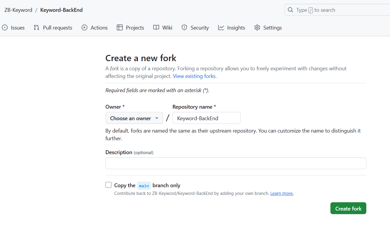 일단 팀장님이 만들어놓은 remote repository에서 fork를 누르면 아래와 같은 화면이 뜬다.