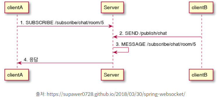 - Spring WebSocket 어플리케이션은 STOMP Broker로 동작.