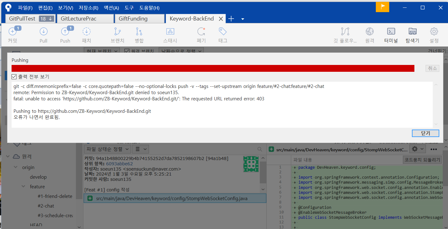 이렇게 뜨면서 remote branch에 push가 안 됐다.