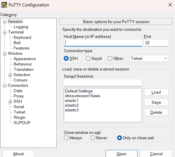 - putty.exe 실행하여 각 항목 등록.