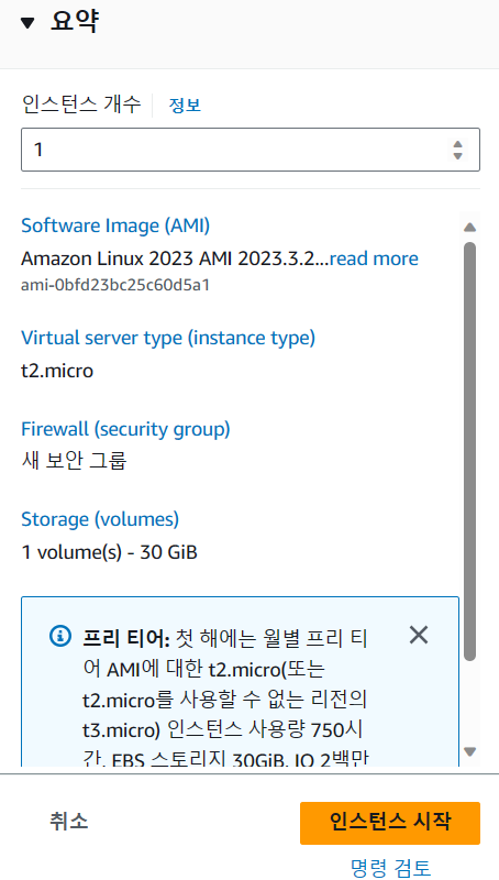 다른 세부 설정들은 그대로 두고 인스턴스 시작