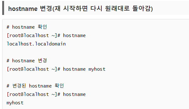 3. 호스트네임 변경 : 현재 접속한 서버의 별명 등록. 실무에서는 한 대의 서버가 아닌 수십 대의 서버가 작동하기 때문에 IP만으로 어떤 서버가 어떤 역할을 하는지 알 수 없음. 이를 구분하기 위해 호스트 네임을 필수로 등록.