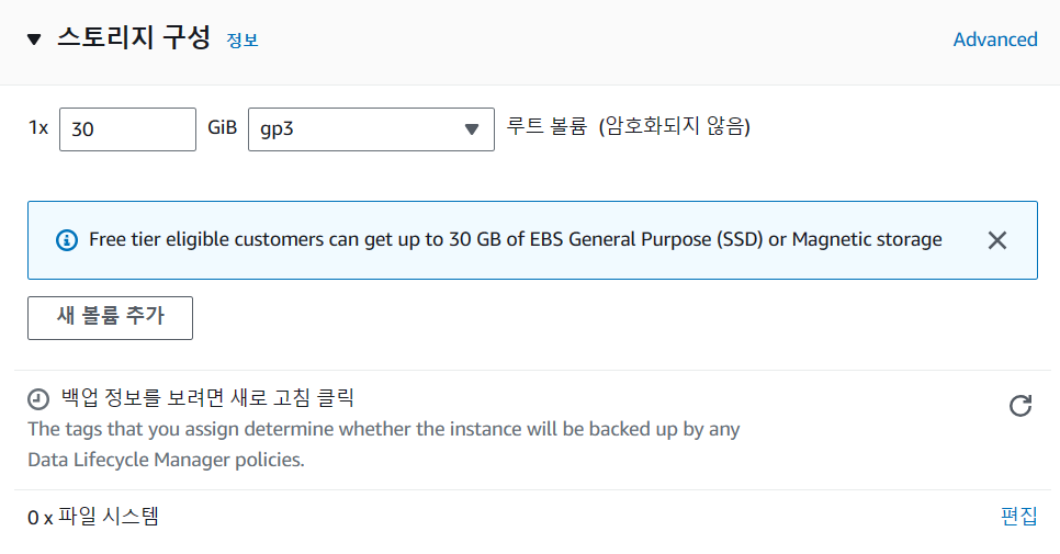 - 기본값은 8GB이며 30GB까지 프리티어로 설정 가능.