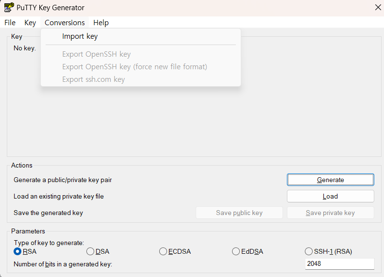 Conversions > Import key 선택해서 내려받은 pem 키 선택.