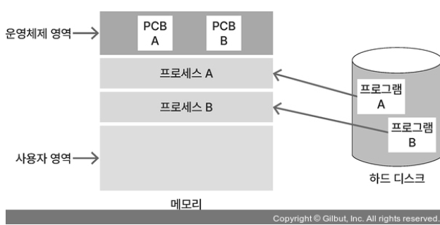 프로세스에 할당된 메모리 영역은 아래 그림과 같으며, PCB는 프로세스 제어 블록이다.