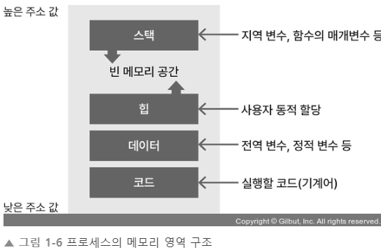- 코드(code) : 실행할 코드가 기계어로 컴파일되어 저장되는 영역으로, 텍스트(text) 영역이라고도 한다.