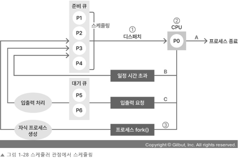 1.2.4 프로세스 상태도에서 스케줄링이 일어나는 시점을 보면 그림과 같다.