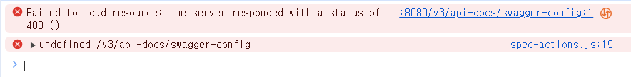 개발자 도구를 확인해보니 /v3/api-docs/swagger-config 리소스를 얻을 수 없다는 것 같다.