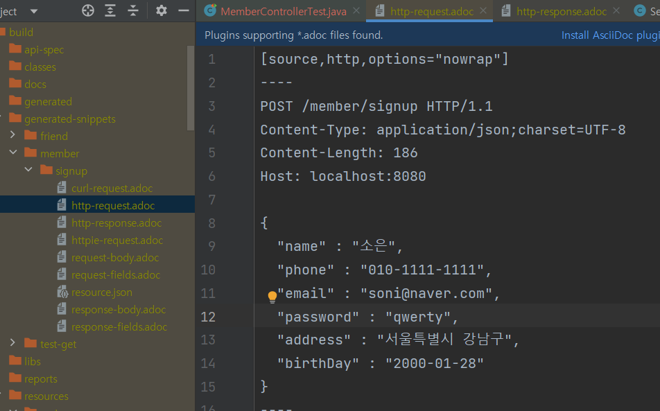 그래서 너무 궁금했는데 이 설정은 RestDocs 관련 설정이라는 것이 갑자기 생각났다 그래서 .adoc 파일을 확인해봤더니 !