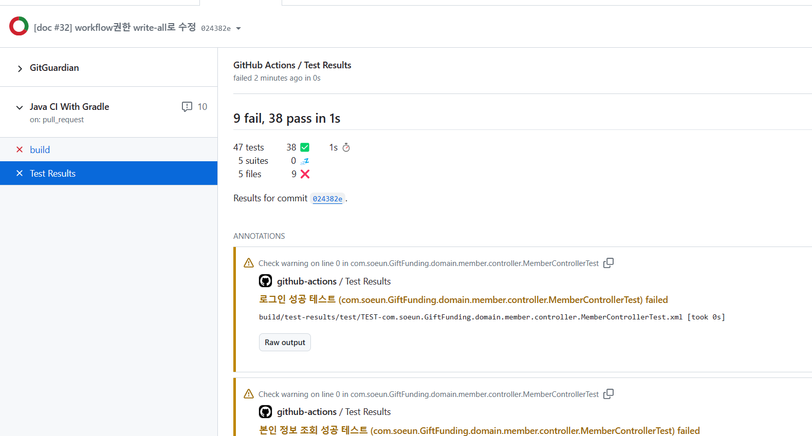 아까는 Test with Gradle과 Publish Test Results 모두 실패했었는데 write 권한을 주고 후자는 성공했다.