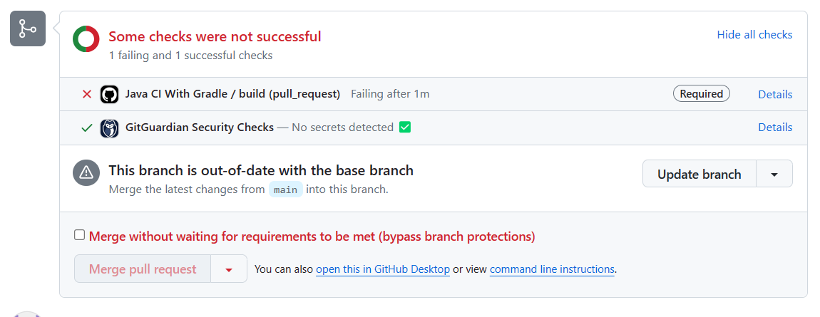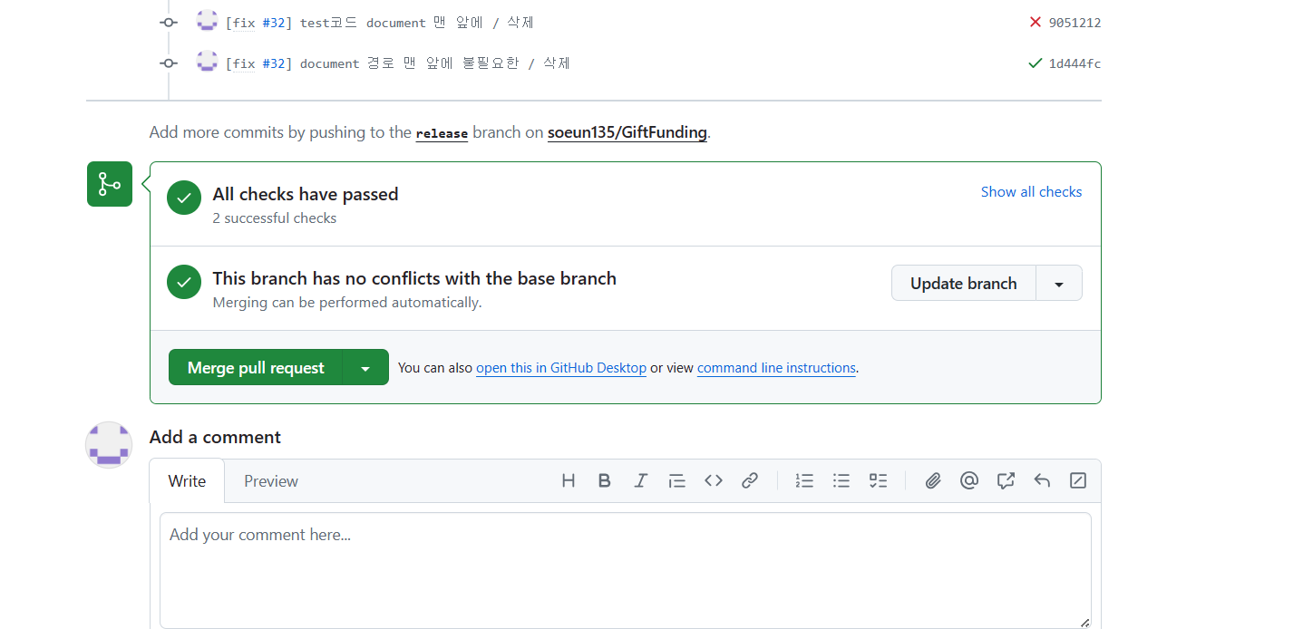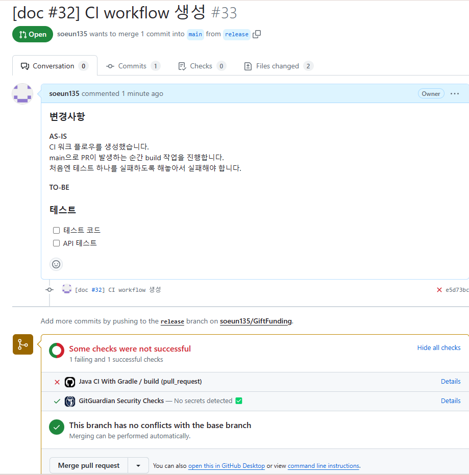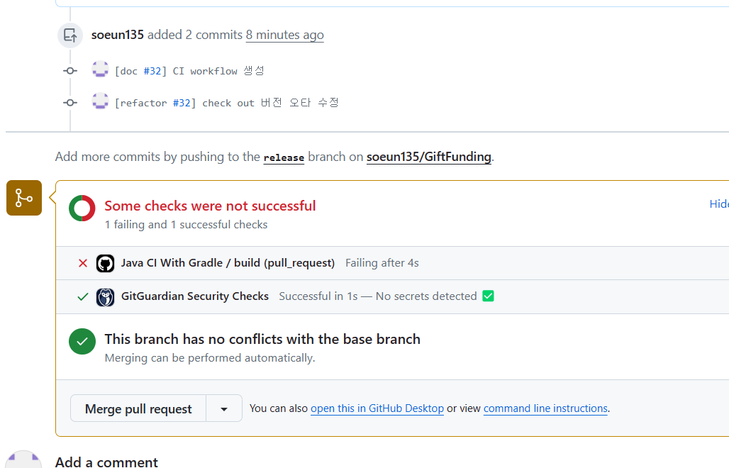 요렇게 빌드가 실패하니까 merge 할 수 없도록 바꼈다 !