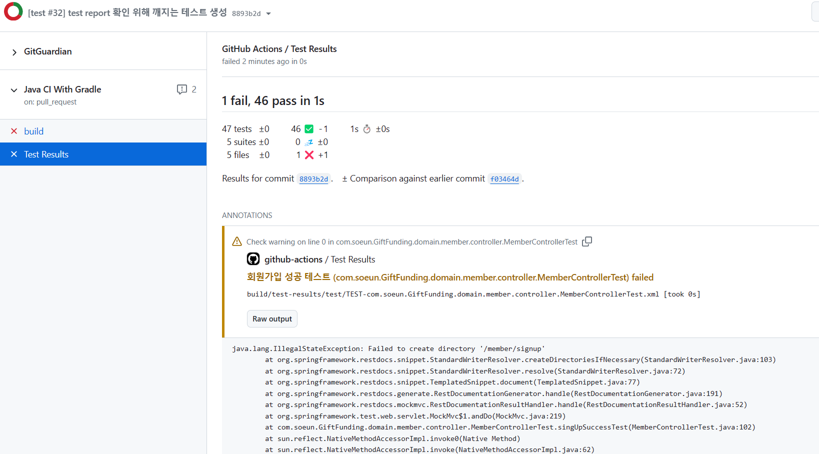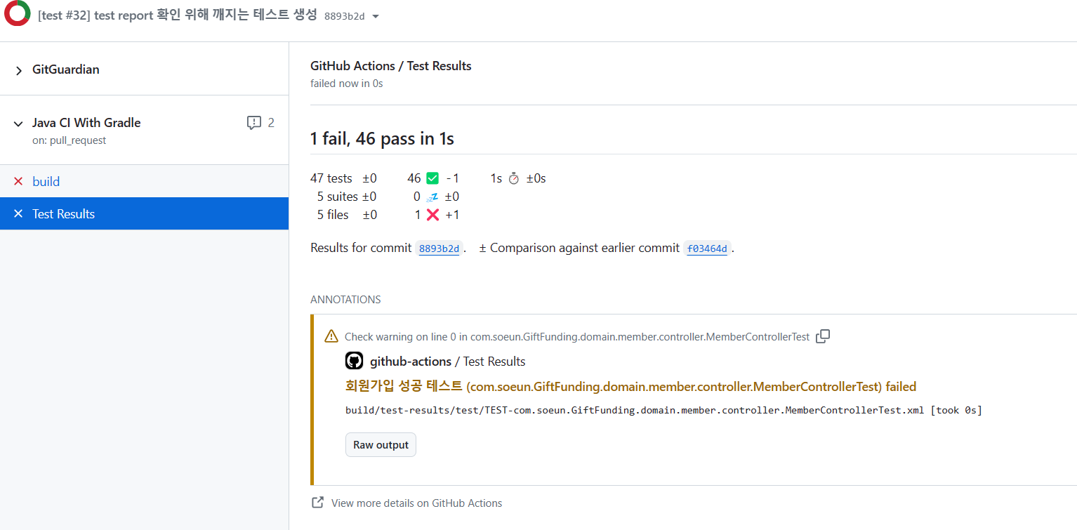 일부러 실패하는 테스트를 만들어놓고 다시 빌드 해보았다.