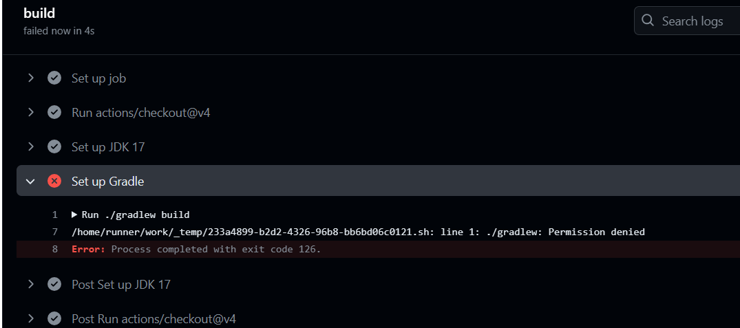 실패한 로그 detail을 들어가면 이렇게 뜬다 ! 그렇다면 아까까진 Publish Test Results 액션이 write 권한이 없어서 실행되고 있지 않았나보다.