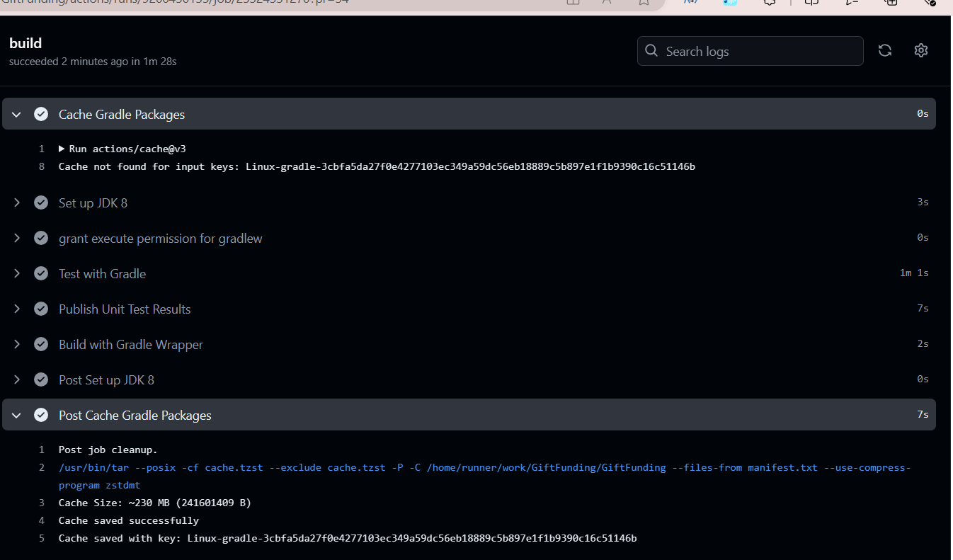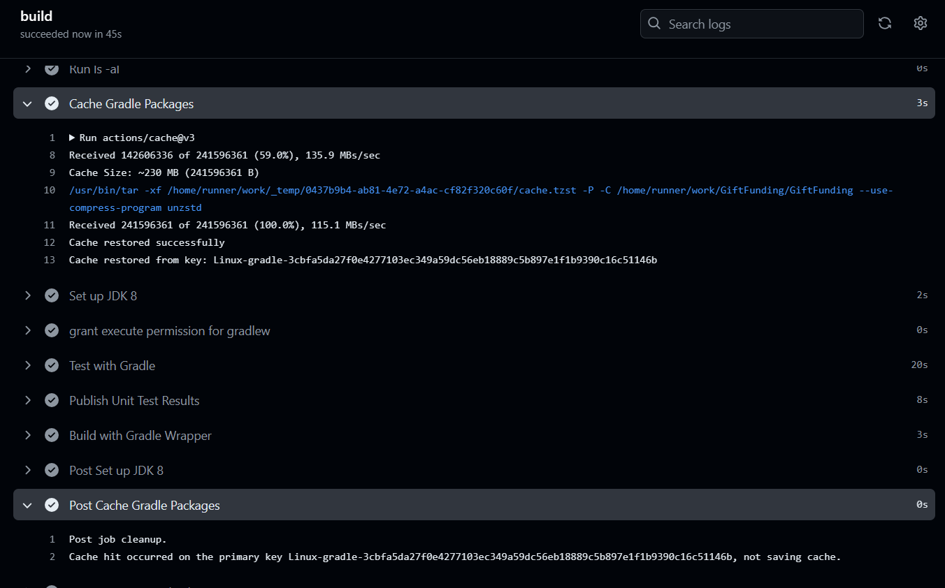 Cache Gradle Packages : 깃허브의 캐시에서 주어진 키에 해당하는 230MB의 압축 파일을 읽어와서 압축을 푸는 것 확인.