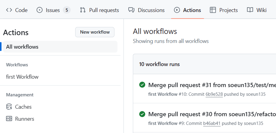 Actions 탭에서 수동으로 워크 플로우를 재실행한 결과는 다음과 같다.