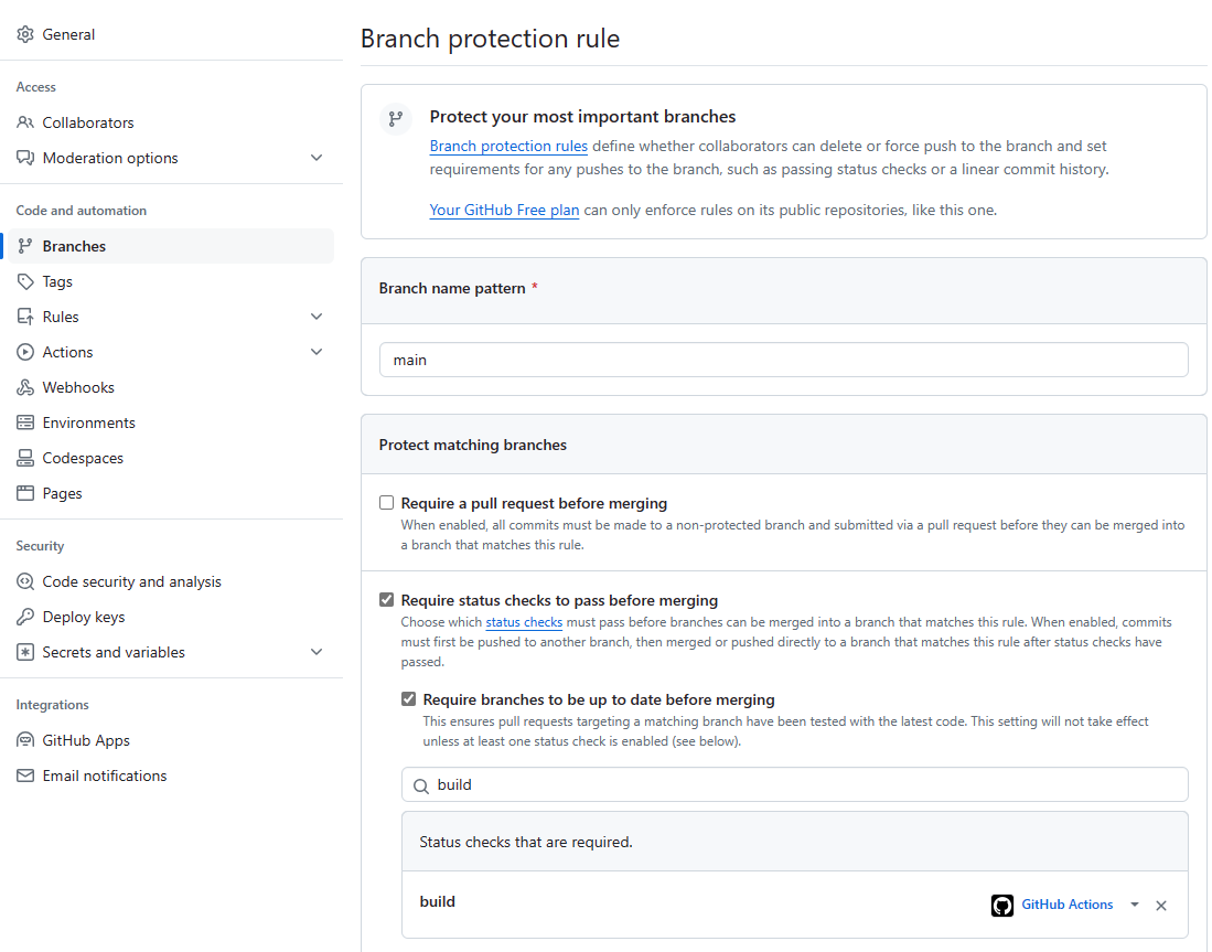 적용할 branch 명을 작성, Require status checkes to pass before merging 체크