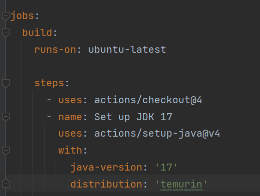 uses: actions/setup-java@v4 // java를 셋업함. 셋업이 필요한 이유는 프로젝트 빌들르 통해 jar파일을 생성하기 위함.