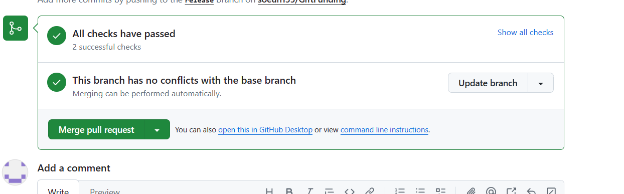 main 브랜치에 PR시 테스트 성공 여부에 따라 Merge 가능 여부가 표시된다.