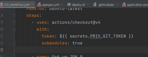 3. CD_WorkFlow.yml 의 체크아웃 부분에 서브모듈에 접근할 수 있게 token 값과 submodule 옵션을 true로 설정