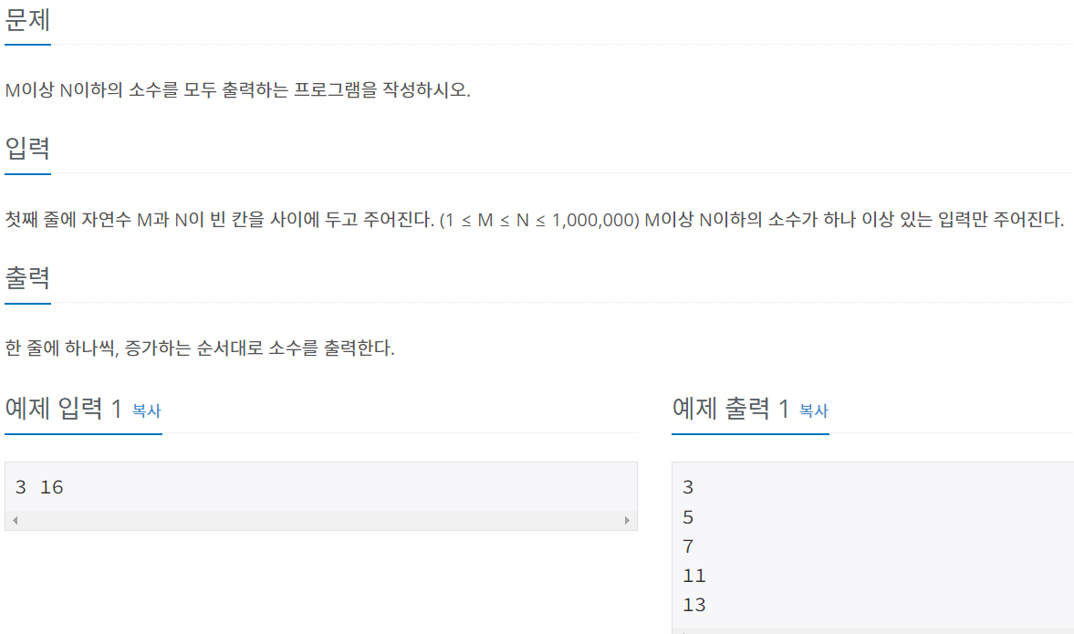 첫째 줄에 자연수 M과 N이 빈 칸을 사이에 두고 주어진다. (1 ≤ M ≤ N ≤ 1,000,000) M이상 N이하의 소수가 하나 이상 있는 입력만 주어진다.