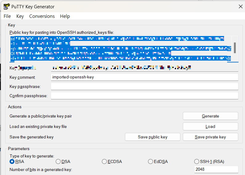 PUTTY gen 실행 -> Conversions -> Import Key로 ec2에서 만든 키페어 파일 선택