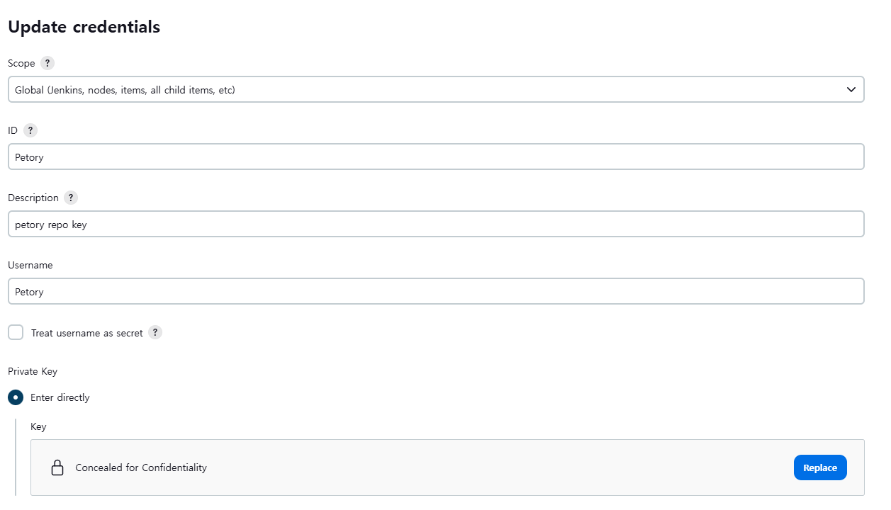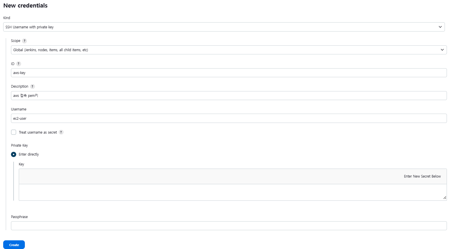 똑같이 credentials를 만들 수 있게 들어가서 이번엔 private key 값에 Personal Access Token을 등록한다.