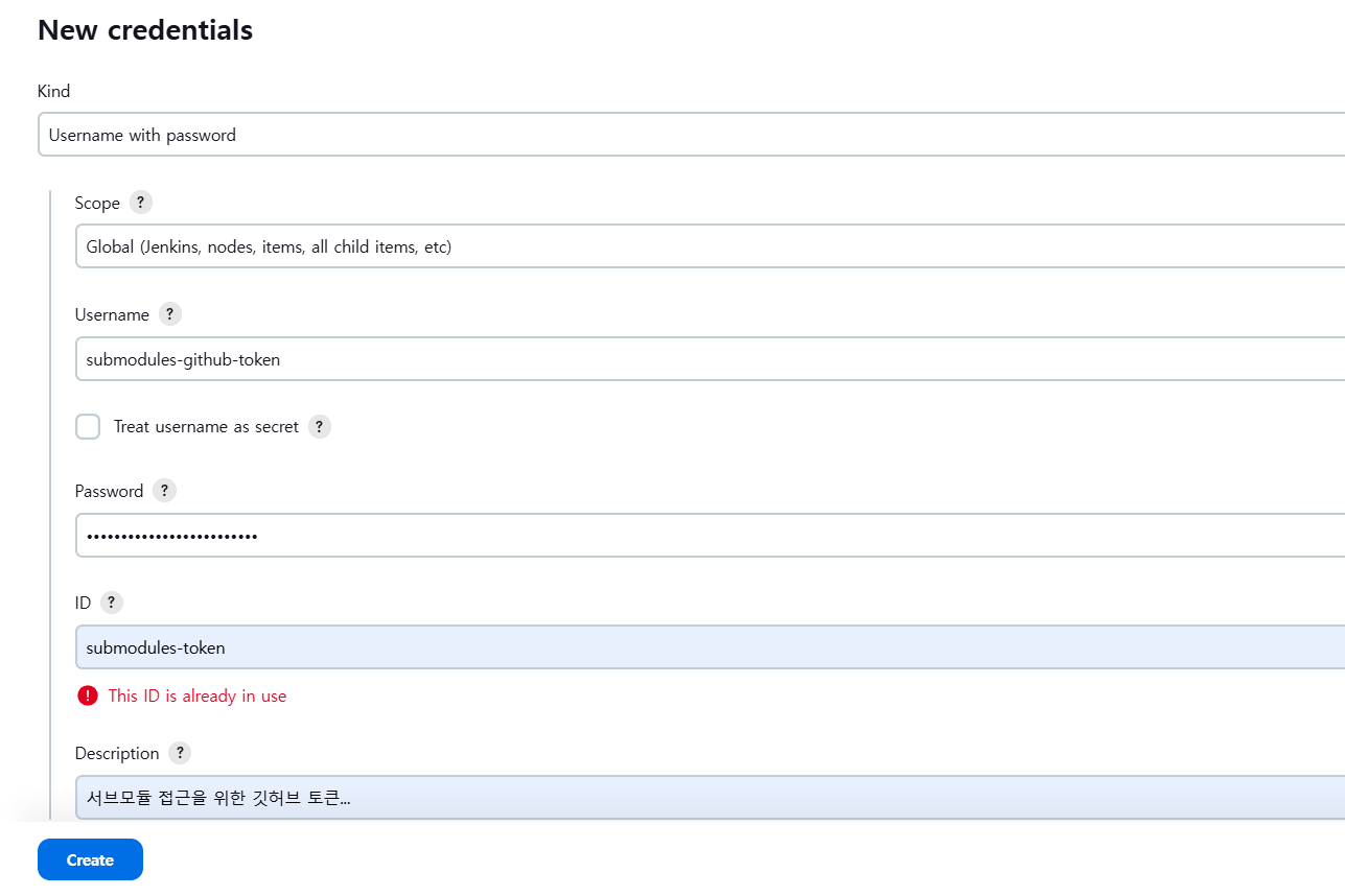 그 과정에 서브모듈의 레포지토리를 접근하는 withCredentials 정보가 들어간다.