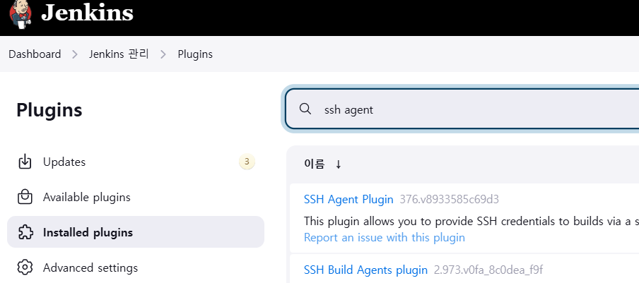 Jenkins 관리 - Plugins - Available plugins에서 ssh Agent 검색 후 설치