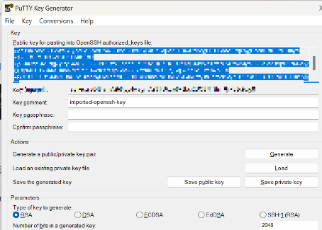 PUTTY gen 실행 -> Conversions -> Import Key로 ec2에서 만든 키페어 파일 선택해당 내용을 복사하고
