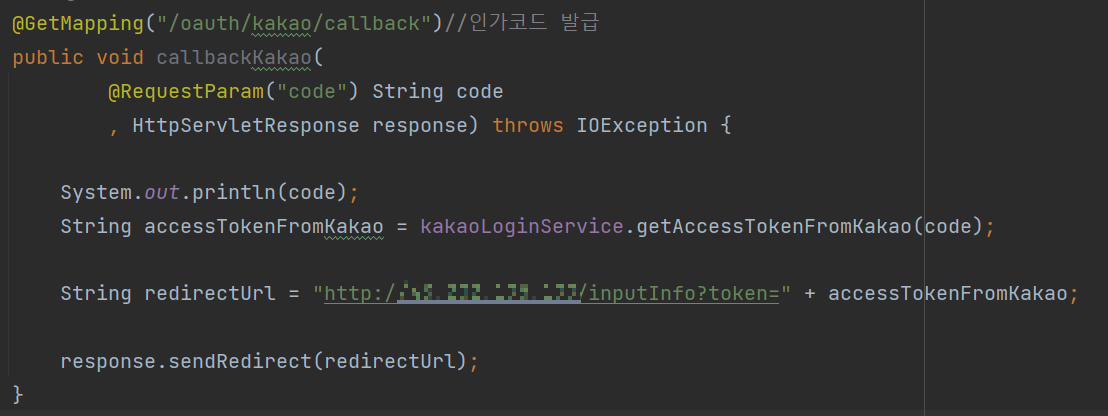 등록해둔 부분과 똑같이 /oauth/kakao/callback?code=code 형식으로 받는다.