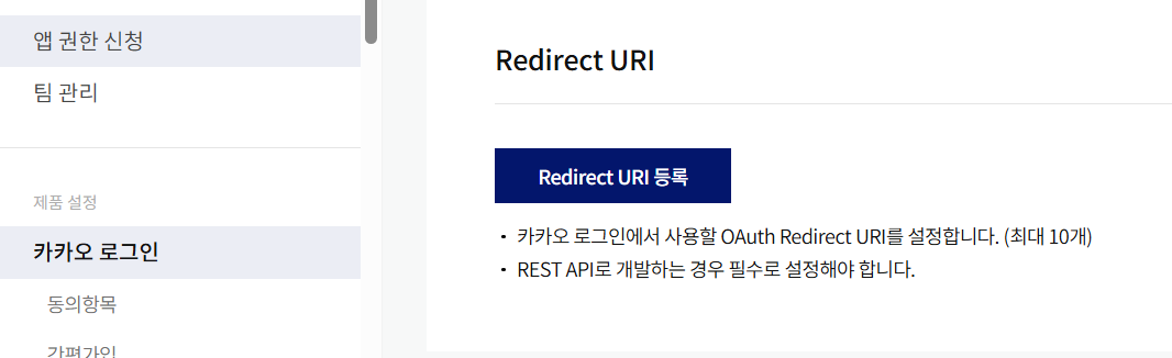 가장 중요한 게 카카오 로그인 완료 후 code를 받을 리다이렉트 URI를 실제 인가 코드를 받아 사용할 URI로 설정해줘야 한다.